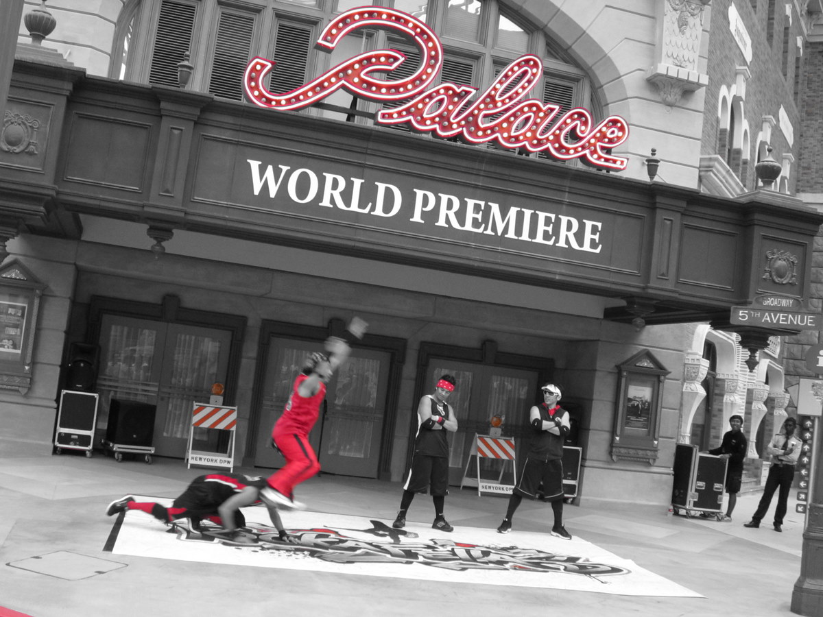 And check out the red accents of the street performers and the signage: