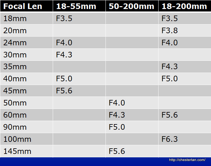 The table below shows the different maximum aperture when the lenses zoom in. The maximum aperture value changes for some zoom lenses because the lens barrel extends as you zoom, resulting in reduction of the effective aperture. Simplistically speaking, less light enters the lens as the lens barrel extend, so the aperture becomes “smaller” and shutter speed is reduced.